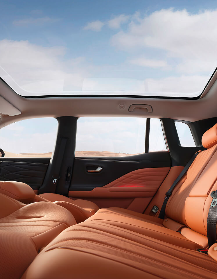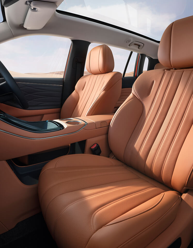 Duża ilość miejsca na nogi oraz płaska podłoga sprawiają, że każda podróż jest komfortowa – zarówno z przodu, jak i na tylnej kanapie. AION V zapewnia swobodę ruchu i naturalną pozycję siedzącą niezależnie od długości trasy.